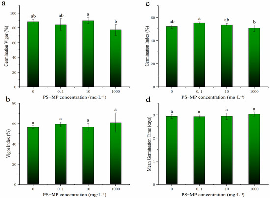 Germination percentage (GP), germination index (GI), vigor index (VI), germination vigor (GV), and mean germination time (MGT) are key indicators used to measure the germination ability of seeds under different conditions [5,36]. Compared with those of the control, no parameters changed significantly, which is consistent with the findings of previous studies. For example, Bosker et al. [13] found that 50 nm, 500 nm, and 4800 nm MPs (Fluoro-Max Green Fluorescent Polymer Microspheres) had no significant effect on the germination rate after 24 h of seed germination.