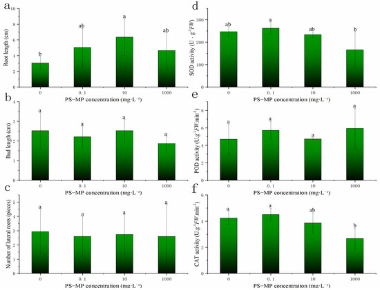 The three panels on the left (a–c) illustrate the effects of different polystyrene microplastics (PS-MP) concentrations on rice root length, bud length, and lateral root number. The three panels on the right (d–f) illustrate the effects of MPs on superoxide dismutase (SOD), peroxidase (POD), and catalase (CAT) activity in rice buds. Note: Vernier calipers was used to measure the lengths of rice roots and shoots during rice germination, and the number of lateral roots was counted. Data are expressed as the mean ± standard error (SE). Lowercase letters indicate significant differences between the germination rates of rice seeds treated with different PS-MP concentrations (p < 0.05), ab represents no significant change from a and b respectively.