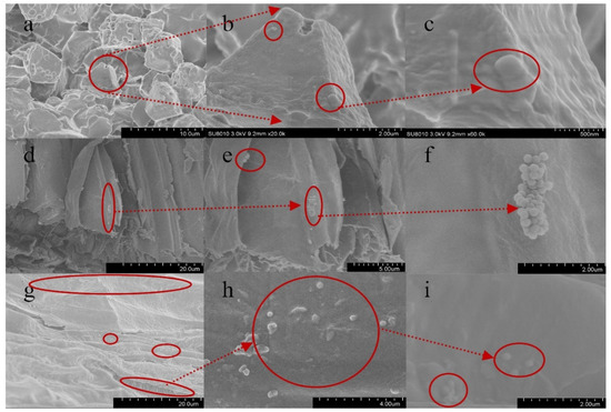 Scanning electron microscopy images of rice seeds, roots, and leaves. Note: the distribution characteristics of PS-MPs in (a–c) rice seeds; (d–f) rice roots; and (g–i) rice buds at a treatment concentration of 1000 mg·L−1. (b) is a part of (a), enlarged; (c) is a part of (b), enlarged; (e) is a part of (d), enlarged; (f) is a part of (e), enlarged; (h) is a part of (g), enlarged; (i) is a part of (h), enlarged.