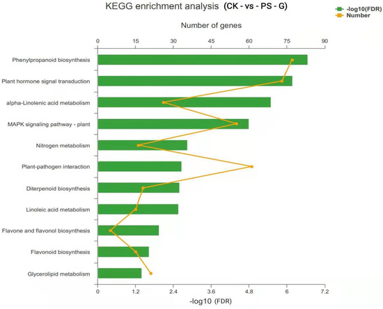 Differentially expressed genes involved in Kyoto Encyclopedia of Genes and Genomes (KEGG) biochemical pathways. Note: The ordinate represents the KEGG pathways, and the upper abscissa represents the number of genes/transcripts of the pathway in the comparison that corresponds to the points on the broken line. The lower abscissa represents the significance level of enrichment, which corresponds to the height of the column, where the greater the −log10 (FDR) value, the more significantly enriched the KEGG pathway is.