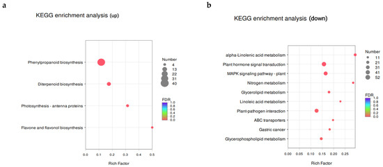 Scatterplot of the Kyoto Encyclopedia of Genes and Genomes (KEGG) pathway enrichment of differentially regulated, differentially expressed genes (DEGs). (a) is the analysis of up-regulated genes, and (b) is the analysis of down-regulated genes. Note: The vertical axis represents the pathway name and the horizontal axis represents the enrichment factor (the ratio of the number of genes/transcripts enriched in the pathway to the number of annotated genes/transcripts). The larger the enrichment factor, the greater the degree of enrichment. The size of the dot indicates the number of genes in the pathway, and the color of the dot corresponds to different Q-value ranges.