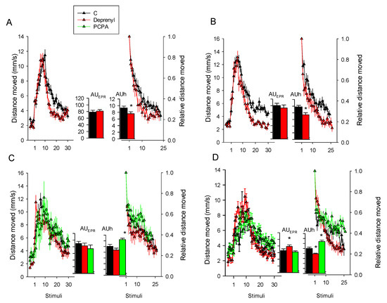 For the Daphnia photomotor response assay (DPRA) to repetitive light stimuli, absolute and proportional distances moved across the tested compounds are reported in Figure 1 and the statistics are referred to the AUC values reported in the graph inlet. The statistics are depicted in Table 1. Deprenyl increased habituation significantly (p < 0.05) in three out of the four experiments (Figure 1A,B,D) and enhanced photomotor responses in only one of them (Figure 1D). PCPA reduced habituation in the two experiments that were performed and did not enhance photomotor responses (Figure 1C,D).