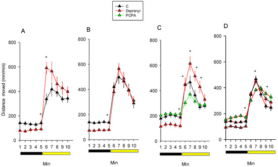 Figure 2. Daphnia basal locomotor activity (BLM) and visual motor responses (VMR) across 5 min in darkness and 5 min with light following 24 h exposures to 1 and 10 mg/L of deprenyl and PCPA, respectively. Plots of the average distance moved ± SE (n = 12–24) per minute across the 10 min of the monitored period are shown. Graphs (A,B) depict the data obtained across two independent experiments for deprenyl exposures and (C,D) for deprenyl and PCPA ones. Note: * during the minutes 5–10, mean significant (p < 0.05) treatment differences relative to the controls following the Student’s t-test or ANOVA and Dunnett’s test.