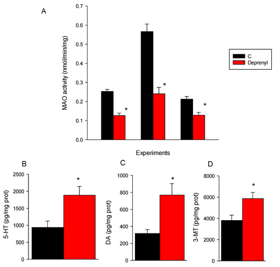 MAO activity was significantly (p < 0.05) inhibited by deprenyl in the three experiments performed (Figure 3A), and deprenyl significantly (p < 0.05) increased serotonin (5-HT), dopamine (DA) and 3-methoxytyramine (3-MT) (Figure 3B–D). Details of the statistics and of nonsignificant metabolite values are provided in Tables S3 and S4, respectively, Supplementary Materials.