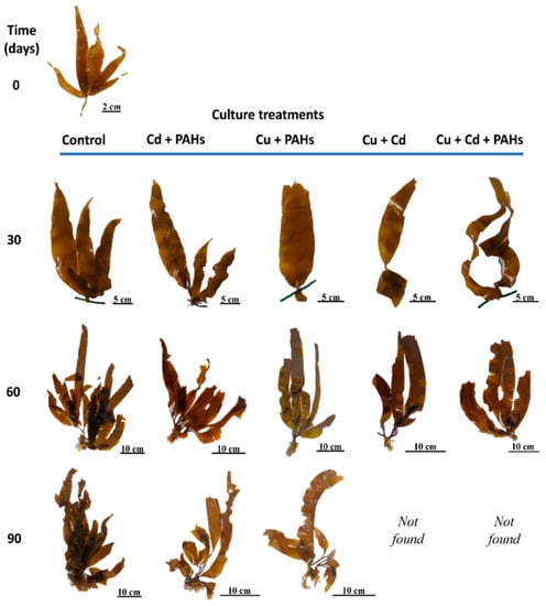 - Espinoza-González, C.; Meynard, A.; Núñez, A.; Castañeda, F.; Oyarzo-Miranda, O.; Rivas, J.; Contreras-Porcia, L. Assessment of the independent and combined effects of Copper and Polycyclic Aromatic Hydrocarbons on gametophytes and sporophytes development of the kelp Lessonia spicata (Phaeophyceae, Ochrophyta). J. Appl. Phycol. 2021, in press. [Google Scholar] [CrossRef]