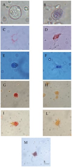 Light micrographs of R. philippinarum haemocytes following exposure to C6O4. (A,B) Unfixed cells stained with Trypan Blue (live cell in (A), dead cell in (B)). (C,D) Haemocytes vitally stained with Neutral Red (intact cell with evident lysosomes in (C), damage cell showing dye loss into the cytosol in (D)). (E,F) Haemocytes stained with Giemsa’s dye (round cell in (E), spreading cell in (F)). (G) Haemocyte positive to acid phosphatase. (H) Haemocyte not positive to acid phosphatase. (I) Haemocyte positive to β-glucuronidase. (L) Haemocyte not positive to β-glucuronidase. (M) Haemocyte with deposits of formazan (blue) after solubilisation with KOH/DMSO solution. Bar length: 5 µm.