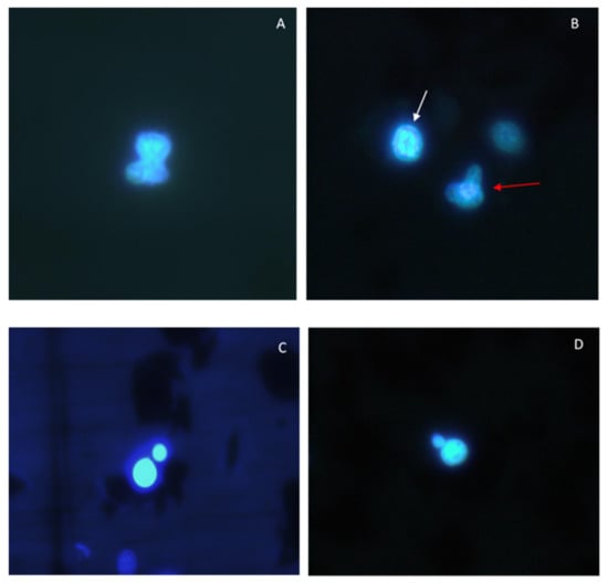 Chromosomal aberrations and micronuclei in R. philippinarum haemocytes following exposure to C6O4. (A) Eight-shaped nucleus. (B) Chromatin margination toward the nuclear membrane (white arrow) and multipolar cell (red arrow). (C,D) Micronuclei.
