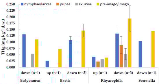 - Kraus, J.M.; Walters, D.M.; Wesner, J.S.; Stricker, C.A.; Schmidt, T.S.; Zuellig, R.E. Metamorphosis Alters Contaminants and Chemical Tracers in Insects: Implications for Food Webs. Environ. Sci. Technol. 2014, 48, 10957–10965. [Google Scholar] [CrossRef] [PubMed] [Green Version]