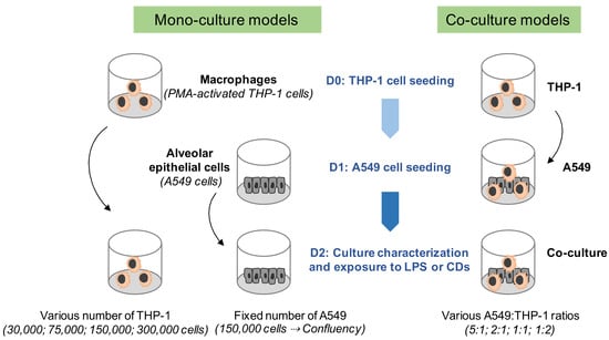 Schematic representation of the mono- and co-culture models used to assess the biological responses evoked by the CDs.