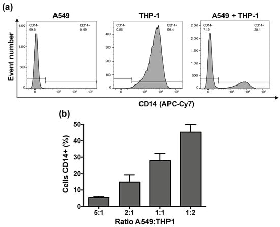 Determination of the proportion of macrophages in the co-culture models by FACS. (a) Staining and gating strategy to discriminate the A549 epithelial cells (CD14-) from the THP-1-derived macrophages (CD14+). (b) Proportion of macrophages (CD14+ cells) within the co-culture according to the A549:THP-1 seeding ratio two days after THP-1 seeding. Data are means ± SEM of n = 3 experiments.