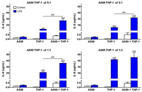 Capacity of the co-culture models to respond to a pro-inflammatory stimulus. Mono- and co-cultures were exposed to 0.01 µg/mL of LPS for 24 h, and the secretion of the pro-inflammatory cytokine IL-8 was measured in the culture supernatants. Data are means ± SEM of n = 3 experiments. Statistical differences at p < 0.05 (one symbol) and p < 0.001 (three symbols) were determined by ANOVA followed by the Tukey’s test when compared to control unexposed cells (asterisks) or to LPS exposed-THP-1 mono-culture (hash).
