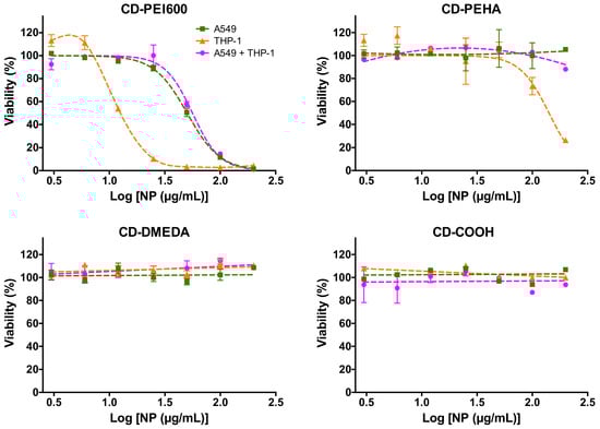 Cytotoxicity of the CDs in mono- and co-cultures. Mono- and co-cultures (A549:THP-1 seeding ratio of 2:1) were exposed to increasing concentrations (3–200 µg/mL) of CD-PEI600, CD-PEHA, CD-DMEDA, or CD-COOH for 24 h, and cell viability was assessed with the MTT assay. Results are expressed as the percentage of viability when compared to the control (unexposed cells). They are means ± SEM of n = 3–6 experiments. Concentration–response curves were obtained after logarithmic transformation of the data and fit with the Hill equation.
