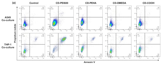 To address this point, we assessed the cytotoxicity and the cell death mechanisms induced by the CDs in each cell type within the co-culture. This was performed through FACS experiments using the CD14 fluorescence labeling (Figure 2a). In the two identified cell populations, the cell death induced by CDs was assessed by combined fluorescence analysis of the annexin V apoptosis (X-axis) and propidium iodide necrosis markers (Y-axis) (Figure 5a). Mono-cultures were analyzed in the same way (data not shown). None of the CDs evoked cell apoptosis whatever the culture model. In contrast, as shown in Figure 5b, cationic CDs with the highest charge density (CD-PEI600) induced potent necrosis of THP-1 cells in the mono- and co-culture models, with no difference between the two models. Thus, macrophages were equally sensitive to the CD toxicity whether they were tested in mono- or co-culture. Besides, we showed that the macrophage cell death mechanism involved necrosis. In the literature, there are some conflicting data about the necrotic effects of NPs because most studies only report cell viability loss without focusing on cell death mode []. However, in line with our data, Wei et al. demonstrated that cationic NPs induce cell necrosis in alveolar macrophages from mouse lung and that this effect is dependent on the NP cationic surface charge []. In this study, cationic NPs (based on PEI or chitosan) lead to rapid necrosis through impairment of Na+/K+-ATPase. Another pathway involved in necrosis induced by NPs is NP degradation in lysosomes and subsequent destabilization of this organelle leading to the release of toxic substances into the cytosol and finally cell necrosis. Based on our previous studies on PEI-based CDs [], we assume that the presence of many polyamine decorations at the surface of CD-PEI600 may promote such a toxicity mechanism in macrophages. In summary of this part, we showed that the cytotoxicity of CDs was dependent on their surface charge density. If the anionic CD did not induce any cytotoxic effect, we provided a ranking of the toxicity of the three cationic CDs that parallels their positive surface charge density, i.e., CD-PEI600 >> CD-PEHA > CD-DMEDA, with no toxicity of CD-DMEDA. In this cytotoxicity evaluation, the analysis of annexin V and propidium iodide markers by FACS was applicable to all cell models, in contrast to the MTT assay, which is better suited to mono-culture models. No added value of the co-culture model compared to macrophages in mono-culture was obtained.