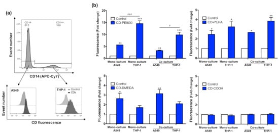 Uptake of CDs in the different culture models and cell types. Mono- and co-cultures (A549:THP-1 seeding ratio of 2:1) were exposed to 25 µg/mL of CDs for 4 h, and CD-uptake was assessed by FACS or 3-D CLSM. (a) Gating strategy to identify the two cell types present within the co-culture and to measure CD cell uptake by FACS after cell staining with an APC-Cy7 anti-CD14 antibody (data from n = 1 experiment). (b) Quantification of CD internalization by FACS. Results are expressed as fold change in fluorescence intensity when compared to control cells, and are means ± SEM of n = 3 experiments. Statistical differences at p < 0.05 (one symbol), p < 0.01 (two symbols) and p < 0.001 (three symbols) were determined by ANOVA followed by the Tukey’s test when compared to control unexposed cells (asterisks) or to CD-exposed A549 cells (hash). (c) 3D view (left, composite of full z-stack) and orthogonal view (right, xz and yz micrograph obtained from an optical slice of a z-stack) from CLSM observation of the co-culture exposed to 25 µg/mL of CD-PEI600 for 4 h. Cells were stained with the fluorescent membrane probe M488 and an anti-human CD14 antibody before observation. A549 cell membrane is colored in green, THP-1 cell membrane is colored in red, and CDs appear in blue and are indicated by white arrows (scale bar = 20 µm).