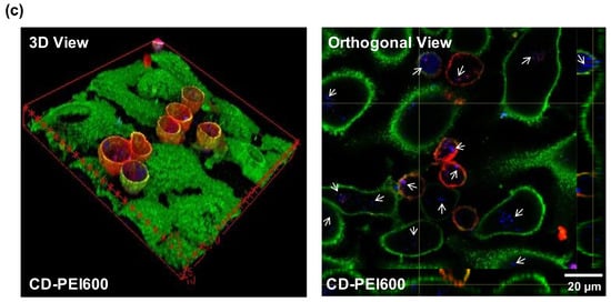 As cell uptake drives NP toxicity [], we investigated the internalization of CDs by epithelial cells and macrophages in our different culture models. Mono- and co-cultures were exposed to 25 µg/mL of CDs for 4 h and CD uptake by A549 and THP-1 cells was assessed by monitoring CD-associated fluorescence by FACS and CLSM after cell staining with a cell membrane fluorescent probe (M488) and/or APC-Cy7 anti-CD14 antibody. As shown in Figure 6a,b, no fluorescence increase was observed in cells exposed to the anionic CD-COOH. In contrast, an increase in CD fluorescence signal was measured in A549 and THP-1 cells treated with cationic CDs in both mono- and co-culture models, with greater uptake of the highly positively charged CD-PEI600. Following observation of the co-culture by 3-D CLSM (Figure 6c), CD-PEI600 was visible as blue spots in the cytoplasm of epithelial cells (membrane in green) and macrophages (membrane in red), which confirmed the uptake of this cationic CDs by the two cell types within the co-culture model. Thus, a direct correlation was observed between the uptake of CDs and their toxicity profile, confirming the influence of the NP zeta potential [] but also of the NP positive surface charge density [] on these effects. In the literature, it has already been reported that a cationic surface charge could promote NP interactions with negatively charged serum proteins and therefore facilitate NP internalization by macrophages, in particular via phagocytosis []. However, whether the density of positive charges on the NP surface can impact the protein corona remains poorly explored [] and will be an interesting focus for future research in the field.