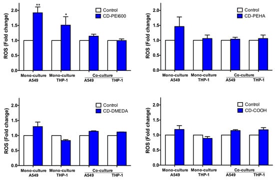 Oxidative stress is considered as a central mechanism of NP toxicity []. So, we investigated ROS production in mono- and co-cultures exposed to CDs for 4 h by FACS. As shown in Figure 7, the cationic CDs with the highest charge density (CD-PEI600), tested at the dose of 50 µg/mL, induced ROS production in A549 and THP-1 mono-cultures. None of the other CDs induced significant ROS production even at the highest tested dose of 200 µg/mL. Thus, cationic CDs with a high charge density have the capability of inducing ROS production in epithelial cells and macrophages, which could lead to cellular damages causing the necrosis that was observed. Surprisingly, no ROS increase in response to CD-PEI600 was measured in A549 and THP-1 cells when combined in the co-culture model. Although ROS production is a commonly used biomarker in nanotoxicology studies carried out on mono-culture models, it is still poorly monitored in co-culture models [,,,,,]. From the few reports found in the literature, it appears that NPs have no [] or little impact on oxidative stress in co-culture models associating epithelial cells and macrophages [,,]. This could be explained by the fact that the cellular interplay of the different cell types may help the cells dealing with oxidative stressors []. On the contrary, it has been recently reported that genes associated with antioxidant defense mechanisms (NFKB1, KEAP1, and NFE2L2) exerted slightly lower effects in the co-culture associating A549 and THP-1 cells as compared to the A549 mono-culture []. Assessing how antioxidant systems are modulated in response to CDs in mono- and co-culture models could be an interesting point to investigate in future work. Anyway, in this present study, we found no added value of the co-culture compared to mono-culture models in the oxidative stress assessment induced by CDs. Furthermore, ROS production for assessing the toxicological effects of CDs proved to be a low-sensitivity marker since among the four tested cationic CDs, only the CD with the highest charge density induced a change in ROS production.