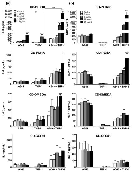 To investigate the inflammatory effect of CDs, the levels of IL-8 and MCP-1 were measured in the supernatants of mono- and co-cultures exposed to CDs at non cytotoxic concentrations (3–25 µg/mL, except for CD-PEI600 in the THP-1 mono-culture, Figure 4) for 24 h (Figure 8). The anionic CD-COOH did not induce any pro-inflammatory effect whatever the model. Regarding the cationic CDs, an IL-8 secretion was measured in the mono-cultures incubated with those with the higher charge density (CD-PEI600), but not with those of lower charge density (CD-PEHA and CD-DMEDA) (Figure 8a). In contrast, an IL-8 secretion was observed in response to all cationic CDs in the co-culture model, with the following ranking: CD-PEI600 > CD-PEHA > CD-DMEDA. In addition, only the co-culture model showed an increase in MCP-1 secretion after exposure to cationic CDs, with the same secretion ranking between CDs than with IL-8 (Figure 8b). Thus, contrary to what was observed for oxidative stress, an increased secretion of pro-inflammatory cytokines (e.g., 20-fold for IL-8 and 10-fold for MCP-1 with CD-PEI600) was evidenced in the co-culture model compared to mono-cultures, suggesting a collaboration mechanism between macrophages and epithelial cells in response to NPs. It has been suggested that such a collaboration mechanism could involve NLRP3 inflammasome [,] or activation of pro-inflammatory transcription factors []. In the literature, other studies using lung co-culture models reported significant pro-inflammatory effects of SiO2 [,], TiO2 [,], CeO2 [], quartz [], PLGA [], polystyrene [], and CuO [] NPs. However, most of these studies either did not compare the inflammatory response measured in co-culture with mono-culture models or compared it only with epithelial cells and not with macrophages [,,,]. Among these studies, only Dekali et al. have actually demonstrated an increased inflammatory response in co-culture compared to epithelial cells and macrophages in mono-culture as we have []. In agreement with our data, the co-culture model of Dekali et al. was established with a A549:THP-1 seeding ratio of 2:1, suggesting that these culture conditions are well appropriate for evaluating NP-induced inflammatory responses []. Applied to our safety study on cationic CDs with increasing charge density, this is particularly relevant since only the co-culture model allowed us to find that CDs of medium (CD-PEHA) and low (CD-DMEDA) positive surface charge density could induce a pro-inflammatory response, with a greater effect for CD-PEHA compared to CD-DMEDA. If our previous work had already showed an inflammatory effect for cationic CDs with a high positive charge density [], we report here for the first-time a pro-inflammatory potential for cationic CDs of lower charge density. By using the co-culture model developed in this work, we also showed that the inflammatory response induced by cationic CD is hierarchically related to the surface charge density of these NPs. Thus, we found a clear added value of the co-culture model compared to mono-cultures for NP-induced toxicological assessment.