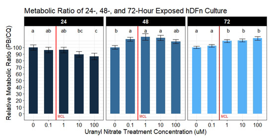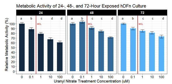Metabolic activity results of UN exposured hDFn. UN decreases PrestoBlue readings in cultured human dermal cells at levels below and above the EPA MCL. Bar charts are faceted by exposure time representing the mean metabolic activity percentage ±StdErr of each treatment group (n = 6 done in sextuplicate). All UN concentrations are in M with -0- representing control group. Statistically significant differences between groups are illustrated by compact letter display with different letters at the top representing a balanced Tukey pairwise t-tests where p-value ≤ 0.05. Group means followed by a common letter were not different at 5% level of significance. Vertical red line illustrates the EPA MCL threshold for uranium (0.126 M).