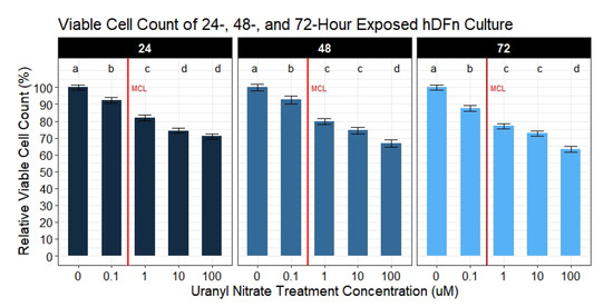 Viable cell count of UN exposed hDFn. Bar charts are faceted by exposure time representing the mean viable cell count percentage ±StdErr of each treatment group (n = 6 done in sextuplicate). All UN concentrations are in M with -0- representing control group. At all days UN levels below EPA MCL caused a significant decrease in viable cell count. Statistically significant differences between groups are illustrated by compact letter display with different letters at the top representing a balanced Tukey pairwise t-tests where p-value ≤ 0.05. Group means followed by a common letter were not different at 5% level of significance. Vertical red line illustrates the EPA MCL threshold for uranium (0.126 M).