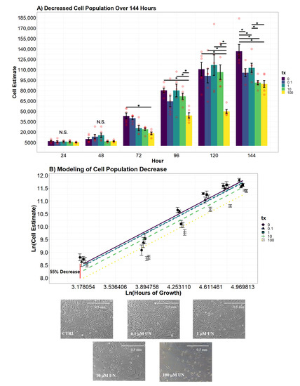 (A) Fibroblast cell population reduced when exposed to increasing levels of UN over 144 hour growth curve (n = 6 for each level of UN). Cell counts were identically and independently collected. Contrasts were performed by a Tukey pairwise t-test across significant variables from an interaction two-way ANOVA. Significance bars, marked with “*”, refer to significant Tukey pairwise t-tests between the conditions at the beginning and the end of the bar. Days where no significant differences were observed are labeled with N.S. (B) Modeled regression lines of ln(cell estimate) growth over 144 h (R = 0.8788). Colors of least squares (LS) lines differentiate UN levels. LS best fit lines represent predicted Ln(cell estimate) based on UN concentration and Ln(hour). Points represent mean cell estimate for each group ±StrErr. Red vertical line represents the largest percent cell estimate difference observed between 100 M and control. Images were taken using light microscopy and used to illustrate differences in cell population after 72 h of exposure (100× total magnification).