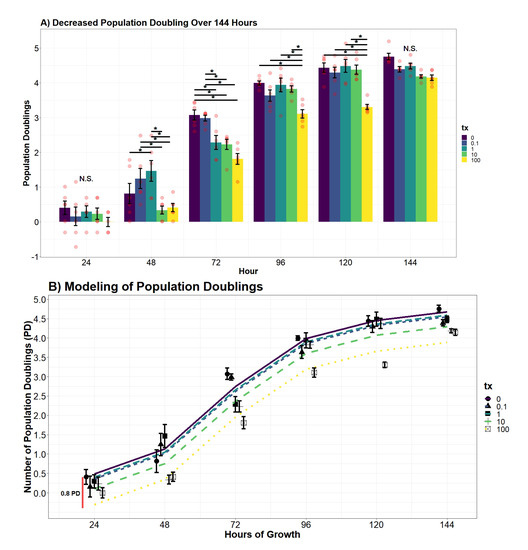 (A) Cell population doublings over a 144 h growth curve (n = 6 for each group). Contrasts were performed by a Tukey pairwise t-test across significant variables from an interaction two-way ANOVA. Significance bars, marked with “*”, refer to significant Tukey pairwise t-tests between the conditions at the beginning and the end of the bar. Time points where no significant differences were observed are labeled with N.S. (B) Polynomial regression modeling of hDFn population doublings (R = 0.9314). Points represent mean PD ±StrErr. Red vertical lines indicates largest PD difference observed between control and 100 M. Colors of least squares (LS) lines differentiate UN levels.
