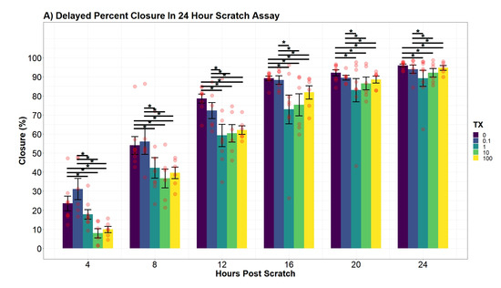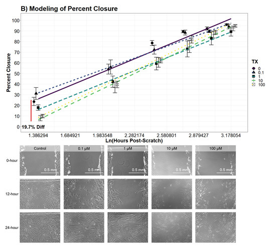 (A) Percent closure differences over a 24 h scratch assay (n = 8 for each condition). Contrasts were performed by a Tukey pairwise t-test across significant variables from an additive two-way ANOVA. Significance bars, marked with “*”, refer to significant Tukey pairwise t-tests between the conditions at the beginning and the end of the bar. (B) Interaction modeling of percent closure across treatments (R = 0.8663). Displayed points represent the mean of each group ±StdErr. Red vertical line represents largest difference observed 4 h post-scratch between control and 10 M. Inverted light microscopy of hDFn migration at 0, 12, and 24 h post scratch (100× total magnification). All initial scratch widths were 1 mm ± 0.1 mm, with no significant differences of beginning scratch width at hour 0.