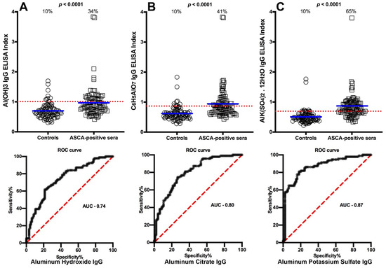 Percentages of samples with elevations in IgG antibodies against three different aluminum compounds in 94 healthy controls and 47 patients positive for ASCA (Crohn’s disease). Dotted horizontal lines indicate the cutoff for positivity used in each assay, as calculated by receiver operating characteristic (ROC) analysis. The percentages of elevation, controls vs. patients, are indicated at the top of each distribution, while the thick short horizontal full bars indicate the respective means (A) The percentage of ASCA-positive patients with elevated IgG antibodies against aluminum hydroxide was 34%, with an area under the curve (AUC) of 0.74; (B) The percentage of ASCA-positive patients with elevated IgG antibodies against aluminum citrate was 41%, with an AUC of 0.80; (C) The percentage of ASCA-positive patients with elevated IgG antibodies against aluminum potassium sulfate was 65%, with an AUC of 0.87.