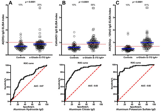 Percentages of samples with elevations in IgG antibodies against three different aluminum compounds in 94 healthy controls and 47 patients positive for gliadin 33-mer peptide and tTG (celiac disease). Dotted horizontal lines indicate the cutoff for positivity used in each assay, as calculated by receiver operating characteristic (ROC) analysis. The percentages of elevation, controls vs. patients, are indicated at the top of each distribution, while the thick short horizontal full bars indicate the respective means (A) The percentage of gliadin- and tTG-positive patients with elevated IgG antibodies against aluminum hydroxide was 20%, with an area under the curve (AUC) of 0.67; (B) The percentage of gliadin- and tTG-positive patients with elevated IgG antibodies against aluminum citrate was 56%, with an AUC of 0.83; (C) The percentage of gliadin- and tTG-positive patients with elevated IgG antibodies against aluminum potassium sulfate was 81%, with an AUC of 0.92.