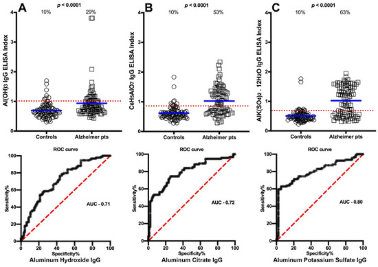 Percentages of samples with elevations in IgG antibodies against three different aluminum compounds in 94 healthy controls and 47 patients positive for Alzheimer’s disease. Dotted horizontal lines indicate the cutoff for positivity used in each assay, as calculated by receiver operating characteristic (ROC) analysis. The percentages of elevation, controls vs. patients, are indicated at the top of each distribution, while the thick short horizontal full bars indicate the respective means (A) The percentage of Alzheimer’s disease patients with elevated IgG antibodies against aluminum hydroxide was 29%, with an area under the curve (AUC) of 0.71; (B) The percentage of Alzheimer’s disease patients with elevated IgG antibodies against aluminum citrate was 53%, with an AUC of 0.72; (C) The percentage of Alzheimer’s disease patients with elevated IgG antibodies against aluminum potassium sulfate was 63%, with an AUC of 0.80.