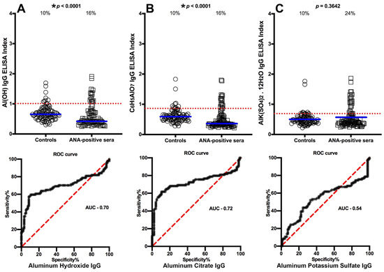 Percentages of samples with elevations in IgG antibodies against three different aluminum compounds in 94 healthy controls and 47 patients positive for antinuclear antibody (ANA) (mixed connective tissue disease [MCTD]). Dotted horizontal lines indicate the cutoff for positivity used in each assay, as calculated by receiver operating characteristic (ROC) analysis. The percentages of elevation, controls vs. patients, are indicated at the top of each distribution, while the thick short horizontal full bars indicate the respective means (A) The percentage of ANA-positive patients with elevated IgG antibodies against aluminum hydroxide was 16%, with an area under the curve (AUC) of 0.70; (B) The percentage of ANA-positive patients with elevated IgG antibodies against aluminum citrate was 16%, with an AUC of 0.72; (C) The percentage of ANA-positive patients with elevated IgG antibodies against aluminum potassium sulfate was 24%, with an AUC of 0.54. * While the p values for aluminum hydroxide and aluminum citrate may appear significant (both p < 0.0001), this is actually misleading, because the means for these two were actually lower than the means of their controls, which means that the resulting values were actually in reverse or insignificant. The p value for aluminum potassium sulfate was clearly not significant (p = 0.3642).
