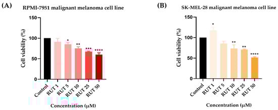 In vitro evaluation of the effect exerted by RUT (1, 5, 10, 25, and 50 µM) after 24 h of treatment on (A) RPMI-7951 and (B) SK-MEL-28 malignant melanoma cells’ viability by performing the MTT assay. Data are presented as viability percentages (%) normalized to Control and expressed as mean values ± SD of three independent experiments performed in triplicate. The statistical differences between Control and the treated group were verified by applying the one-way ANOVA analysis followed by Dunnett’s multiple comparisons post-test (* p < 0.1; ** p < 0.01; *** p < 0.001; **** p < 0.0001).