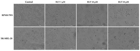 As a component of the anti-melanoma profile of RUT, an evaluation of its impact on the morphology of RPMI-7951 and SK-MEL-28 cells has been performed. RPMI-7951 cells are adherent cells with an epithelial-like morphology and several changes were identified in their morphology and confluence following RUT treatment (Figure 2), such as a dose-dependent reduction of confluence, loss of adherence, and roundish cells were observed mainly at 10 and 50 µM. A similar effect was detected in the case of SK-MEL-28 cells, human melanoma cells with a polygonal morphology, the most noticeable signs being recorded at the highest concentrations tested—10 and 50 µM (Figure 2). The changes observed in both human melanoma cells indicate the cytotoxic effect of RUT treatment and could be characterized as apoptotic-specific signs. These data support the cell viability results.