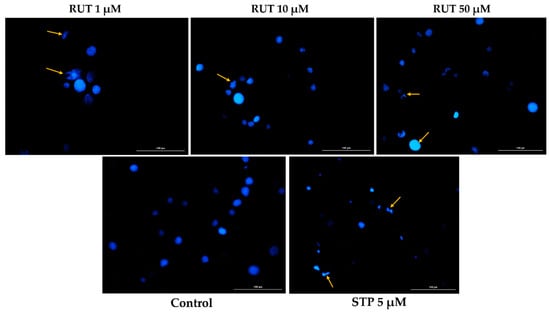 The potential toxicity of RUT at the nuclear level was tested by applying the Hoechst 33342 staining assay protocol according to the manufacturer’s (Thermo Fisher Scientific, Inc., Waltham, MA, USA) recommendations. In brief, the RPMI-7951 and SK-MEL-28 cells were seeded in 12-well plates (105 cells/1.5 mL/well) and treated with three selected concentrations (1, 10, and 50 µM) of RUT in DMSO for 24 h. After the stimulation period, the media was removed, and the staining solution diluted at 1:2000 in PBS was added (500 µL/well). The plates were incubated for 10 min at room temperature, protected from light. Finally, the staining solution was washed with PBS and the pictures were taken using Cytation 1 (BioTek Instruments Inc., Winooski, VT, USA) and analyzed by the means of Gen5™ Microplate Data Collection and Analysis Software (BioTek Instruments Inc., Winooski, VT, USA). Staurosporine (STP) 5 µM was selected as a positive control for apoptosis. The apoptotic index (AI) was calculated according to a formula described by Xu et al. []: