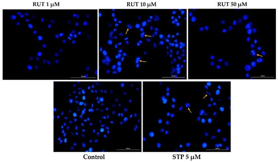 Hoechst 33342 staining of RPMI-7951 cells’ nuclei following the 24 h treatment with RUT 1, 10, and 50 µM. The yellow arrows indicate nuclei expressing abnormal features. The scale bars represent 100 µm.