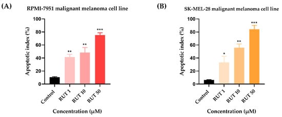 Calculated apoptotic index (AI) in Hoechst 33342 stained RPMI-7951 (A) and SK-MEL-28 (B) MM cells following the 24 h treatment with RUT (1, 10, and 50 µM). Data are presented as an apoptotic index (%) normalized to Control and expressed as mean values ± SD of three independent experiments. The statistical differences between Control and the treated group were verified by applying the one-way ANOVA analysis followed by Dunnett’s multiple comparisons post-test (* p < 0.1; ** p < 0.01; *** p < 0.001).