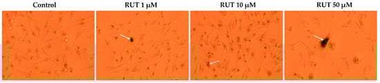 Pictures (10× magnification) of X-Gal staining of senescent SK-MEL-28 cells after a 24 h treatment with RUT (1, 10, and 50 µM). The white arrows indicate cells undergoing senescence.