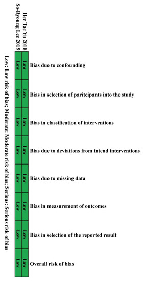 - Sterne, J.A.; Hernán, M.A.; Reeves, B.C.; Savović, J.; Berkman, N.D.; Viswanathan, M.; Henry, D.; Altman, D.G.; Ansari, M.T.; Boutron, I.; et al. Robins-i: A tool for assessing risk of bias in non-randomised studies of interventions. BMJ 2016, 355, i4919. [Google Scholar] [CrossRef] [PubMed]