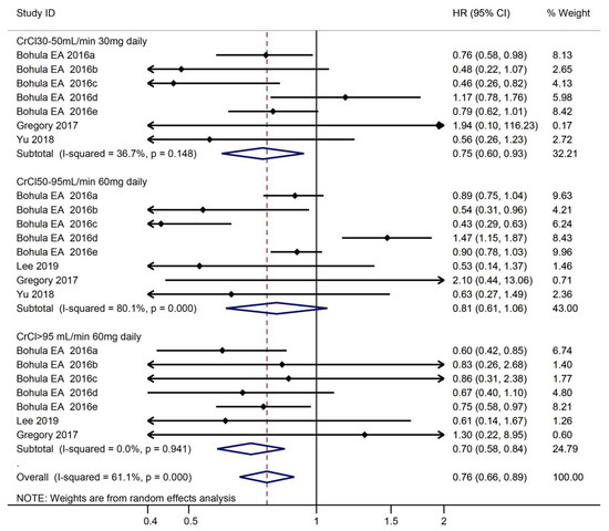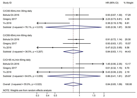 - Nielsen, P.B.; Lane, D.A.; Rasmussen, L.H.; Lip, G.Y.; Larsen, T.B. Renal function and non-vitamin k oral anticoagulants in comparison with warfarin on safety and efficacy outcomes in atrial fibrillation patients: A systemic review and meta-regression analysis. Clin. Res. Cardiol. Off. J. Ger. Card. Soc. 2015, 104, 418–429. [Google Scholar] [CrossRef]
