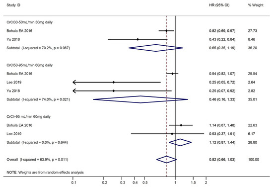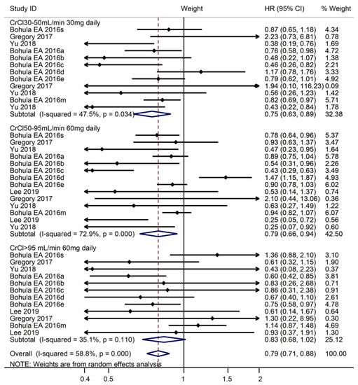 - Zou, R.; Tao, J.; Shi, W.; Yang, M.; Li, H.; Lin, X.; Yang, S.; Hua, P. Meta-analysis of safety and efficacy for direct oral anticoagulation treatment of non-valvular atrial fibrillation in relation to renal function. Thromb. Res. 2017, 160, 41–50. [Google Scholar] [CrossRef]