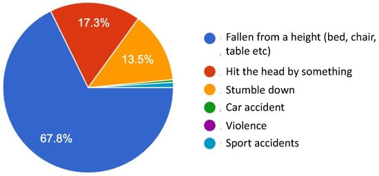 Of all the study participants, 78% of their children have been concussed. The most common symptoms reported were crying, vomiting, nausea, diarrhea, loss of appetite, and headaches. The terms of emotional changes after experiencing concussion were crying, anger, sadness, mood swings, and heightened emotion, represented in 66.3%, 23.8%, 6.3%, 5.5%, and 1.5%, respectively. In addition, 2% of the children experienced memory loss following a concussion and 4.8% observed a decrease in concentration in their children. Considering the causes of concussion, falls from heights were the most common cause of concussion in children at 67.8% (Figure 1). Other common causes were being hit in the head with something and stumbling, and others.