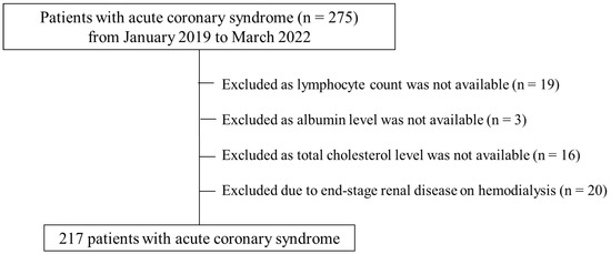 We retrospectively examined 275 consecutive patients who underwent PCI for ACS with stenting. These patients were admitted to Hamamatsu University Hospital between January 2019 and March 2022. This study included patients with medical records that had necessary information to determine malnutrition using the CONUT scoring system and those with 1-year follow-up clinical assessments. Patients who lacked laboratory data, including total lymphocyte counts, serum albumin levels, and total cholesterol levels and patients undergoing hemodialysis were excluded. This study was performed in accordance with the Declaration of Helsinki and approved by the Institutional Review Board of Hamamatsu University School of Medicine (approval number: 23–128), with a waiver for informed consent.
