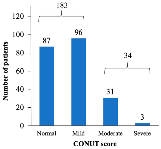 The CONUT score was used to screen and evaluate malnutrition severity in the normal or mild (n = 183, 84.3%) and moderate or severe (n = 34, 15.7%) malnutrition groups (Figure 2).