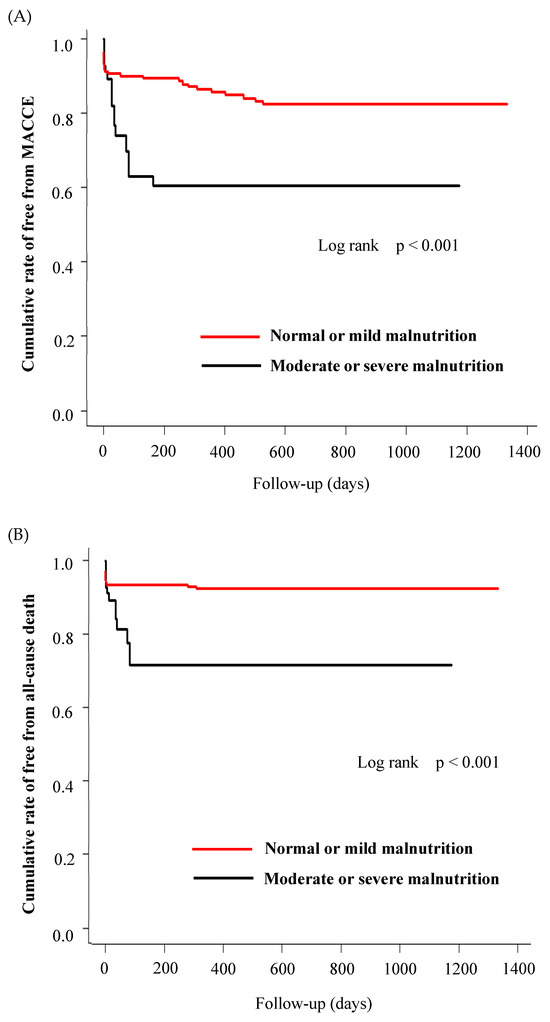 Kaplan–Meier survival curves for normal or mild malnutrition vs. moderate or severe malnutrition in ACS patients following PCI for (A) major adverse cardiovascular and cerebrovascular events (MACCE) and (B) all-cause death after inverse probability treatment weighting analysis.