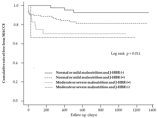 The Kaplan−Meier curves demonstrated that MACCE significantly differed among patients with normal or mild malnutrition plus J-HBR, normal or mild malnutrition only, moderate or severe malnutrition plus J-HBR, and moderate or severe malnutrition only (p = 0.001). MACCE incidence was similar between severely malnourished patients with J-HBR and those without J-HBR (Figure 4).
