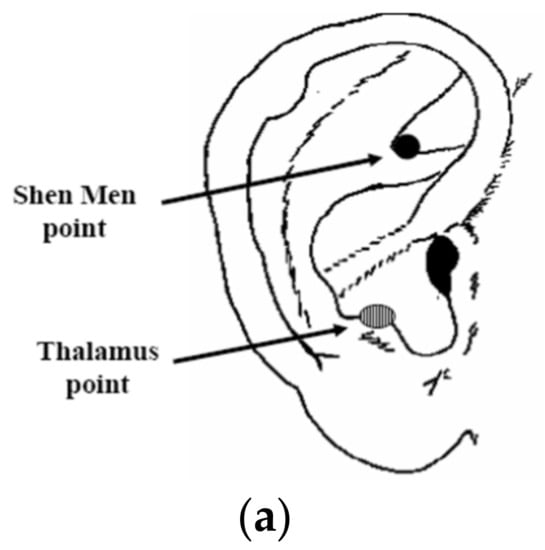Notably, 18 healthy volunteers were enrolled, 8 of them were males and 10 were females, and their average age was 29.05 ± 5.53 years. They were crossover randomized to be treated with auricular acupuncture both with 2 Hz and with 100 Hz on the auricle. We chose the dominant side for the execution of acupuncture, so we stimulated the right ear of all patients enrolled (we have executed brain lateralization clinical tests on all patients before). This is a randomized crossover study, in which two different sessions of treatment with auricular acupuncture lasting 20 min have been performed, separated by two weeks. The enrolled patients have been randomly assigned to two groups, to start either with the performance of the low-frequency stimulation or with the high-frequency stimulation session. The points stimulated were as follows: Shenmenn point, located on the apex of the triangular dimple, and the thalamus point, located on the inner margin of the antitragus (Figure 1a).