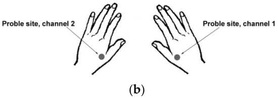 Then two probes belonging to a fluxmeter laser-doppler for measuring the microcirculation variations have been placed on the back of both the hands, between the first and the second metacarpal bone (Figure 1b).
