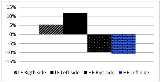 Percentage variation of PU (Perfusion Unit) with high frequency (HF) and low frequency (LF) stimulation.