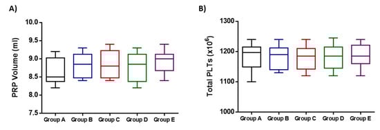 Quality characteristics of the obtained PRP from the participants of the study. (A) Determination of PRP volume of all participants. (B) Determination of the total PLT number of all participants. No statistically significant differences were observed either in PRP volume (p = 0.696) or total PLTs (p = 0.999) between all participants of this study.