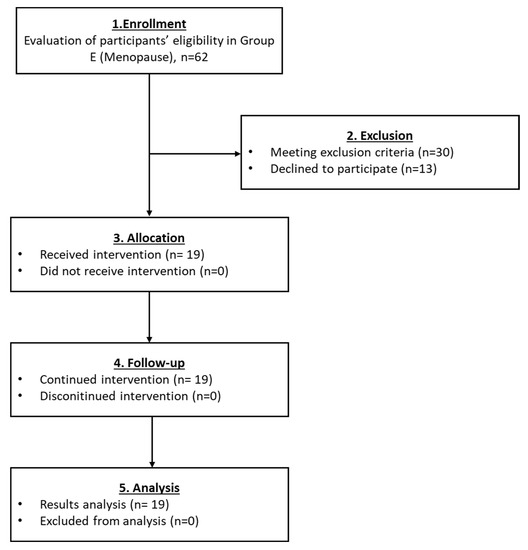 The current pilot study was initiated between May 2018 and December 2021 and involved the enrollment of 582 participants aged 22–56 years, who presented POI, POR, perimenopause and menopause. From those, only 25 women met the inclusion criteria, were classified into five groups and participated in the proposed pilot study. A detailed description of the workflow of each group is provided in Figure 2, Figure 3, Figure 4, Figure 5 and Figure 6. The results of this study showed a decrease in FSH and LH levels and in parallel the elevation of E2 and AMH after the first month of the follow-up. The same outcome was maintained after the second month of the follow-up in the majority of the participants.
