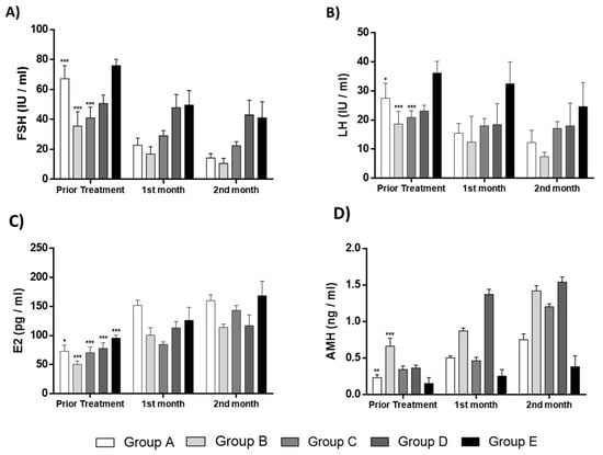 Representable diagrams regarding the levels of FSH, LH, E2 and AMH of the current pilot study. (A) FSH levels of all groups prior treatment, after the 1st and 2nd month follow-up. Statistically significant differences were observed in FSH levels before and after the PRP administration in the groups A (p < 0.001), B (p < 0.001) and C (p < 0.001). (B) LH levels of all groups prior treatment, after the 1st and 2nd month follow-up. Statistically significant differences were observed in LH levels before and after the PRP administration in the groups A (p < 0.05) and B (p < 0.001). (C) E2 of all groups prior to treatment, after the 1st and 2nd month follow-up. Statistically significant differences were observed in E2 levels before and after the PRP administration in all groups (p < 0.001). (D) AMH of all groups prior treatment, after the 1st and 2nd month follow-up. Statistically significant differences were observed in AMH levels before and after the PRP administration in groups A (p < 0.01) and B (p < 0.001). * p < 0.05, ** p < 0.01, *** p < 0.001.